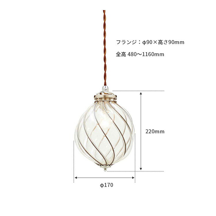 商品サイズ シェードのサイズ/直径170×高さ220(mm) 全高/最短480〜最長1160(mm) コード長/900(mm) ※コード長調節可 フランジサイズ/直径90×高さ90(mm) 重量 約0.7(kg) 材質 ガラス、スチール カラー クリア、アンバー 仕様 口金/E17 60ワットまで対応(電球なし) ※白熱電球・LED電球(外径37mm以下のもの)使用可 ※電球型蛍光灯使用不可 壁スイッチ/点灯→消灯 よりコード仕様 注意事項 お買い物の際は、会社概要の「その他の注意点」を必ずご確認ください。